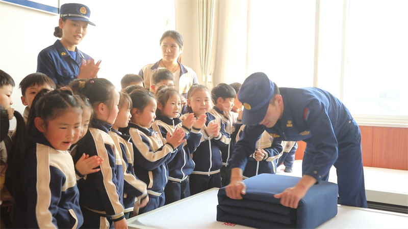 在内务参观环节,消防指战员的寝室令孩子们惊叹不已。消防员现场演示叠被技巧时,孩子们自发围成半圆,有的踮脚观察,有的模仿折叠动作,棱角分明的“豆腐块”被子赢得了孩子们阵阵赞美。现场气氛十分活跃。