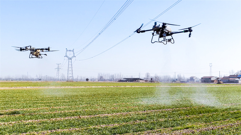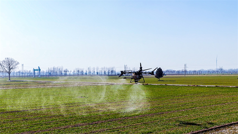 1月13日,董店街道办事处皇台村的高标准农田里,两架无人机正轻盈掠过绿意初绽的麦田,均匀喷洒叶面肥。眼下正值冬季田间管理的关键期,当地农户抢抓晴好天气,利用智能科技为小麦“强身健体”,为夏粮丰收夯实基础。
