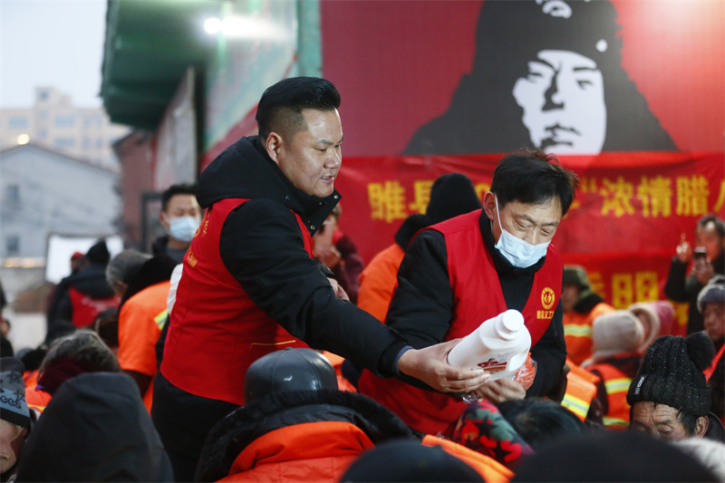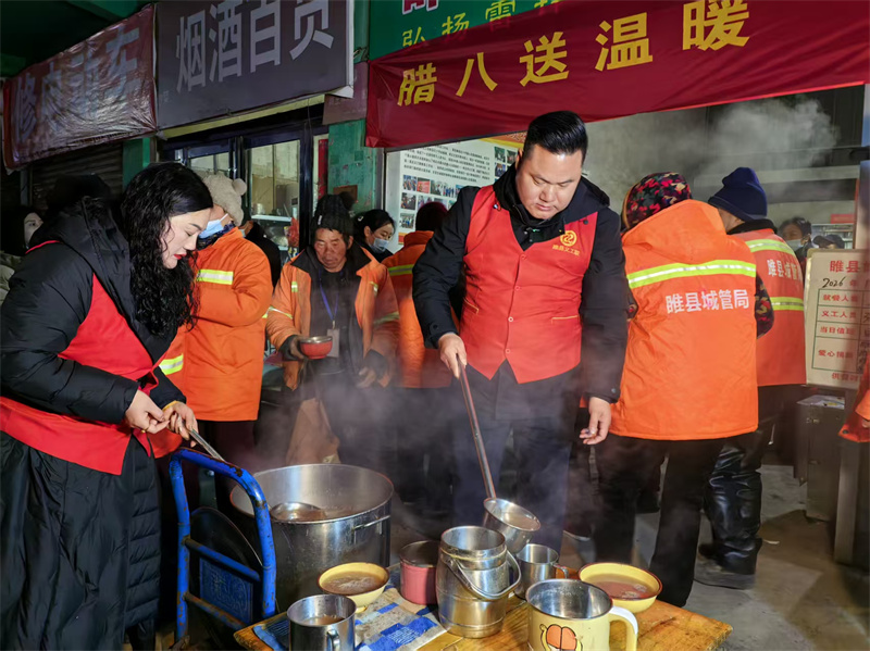 “慢点,小心烫着,不够吃再来添。”爱心人士一边为环卫工人盛粥舀菜,一边细心叮嘱。一碗碗热气腾腾的腊八粥递到每一位环卫工人手中,这一刻,蒸腾的不仅是腊八粥的暖意,更是人与人之间最朴素的真挚情感。