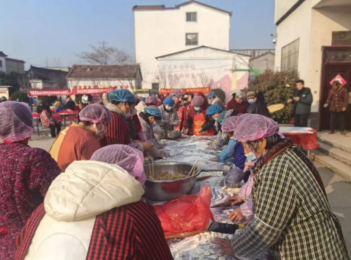 舞台上热闹非凡,舞台下温情涌动。镇、村干部、党员志愿者、还有为此次活动提供赞助的热心人与村民们围坐在一起包饺子。大家分工协作,和面、调馅、擀皮、包捏,欢声笑语中,一个个圆润饱满的饺子很快摆满了托盘。热气腾腾的饺子出锅后,大家共同品尝,感受着“家”的温暖与节日的团圆。