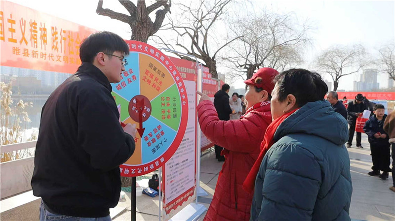 活动还创新设置趣味互动环节,将移风易俗树新风主题宣传融入其中。居民通过趣味投球游戏参与“新风十条”学习宣传,完成知识问答即可兑换奖品。现场还设置社会主义核心价值观互动转盘,参与者转动转盘并准确说出对应内容即可获得积分。大家在轻松欢乐的体验中赢取精美奖品,同时学习文明节俭、健康向上的过节新风,让文明新风入脑入心。