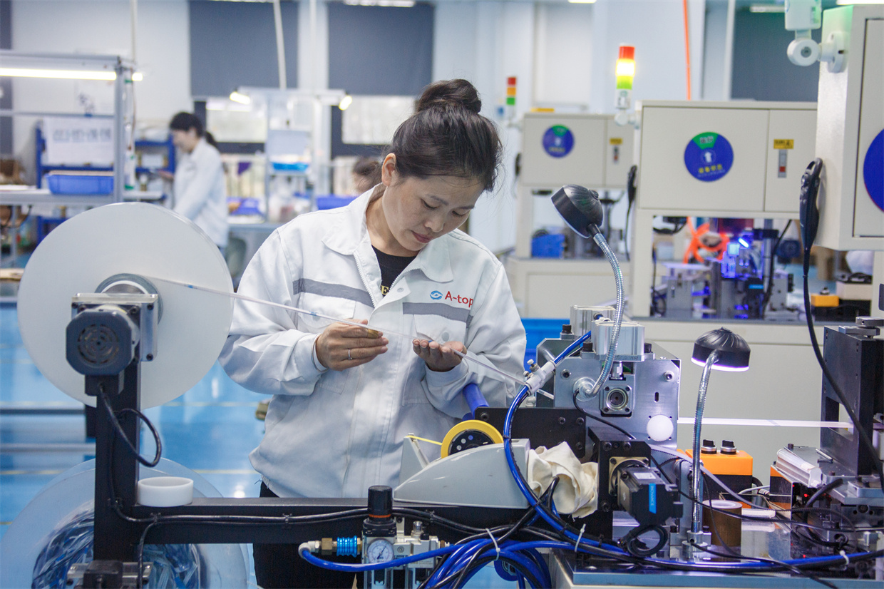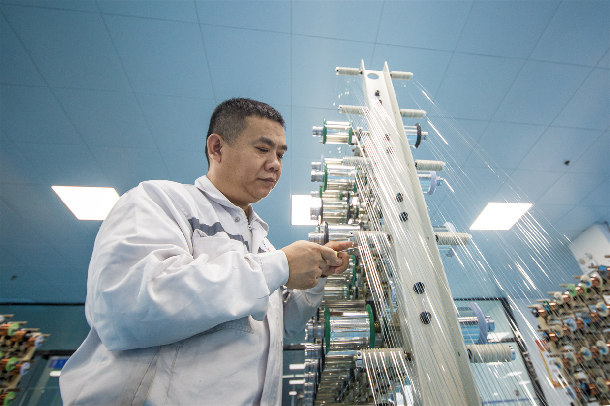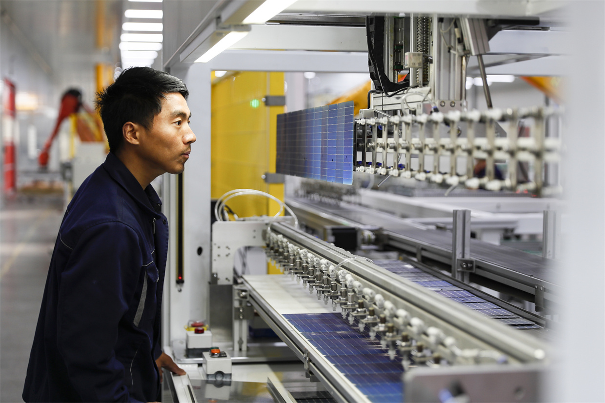 光伏面板生产企业车间内,工人在生产线上忙碌。 徐泽源 摄