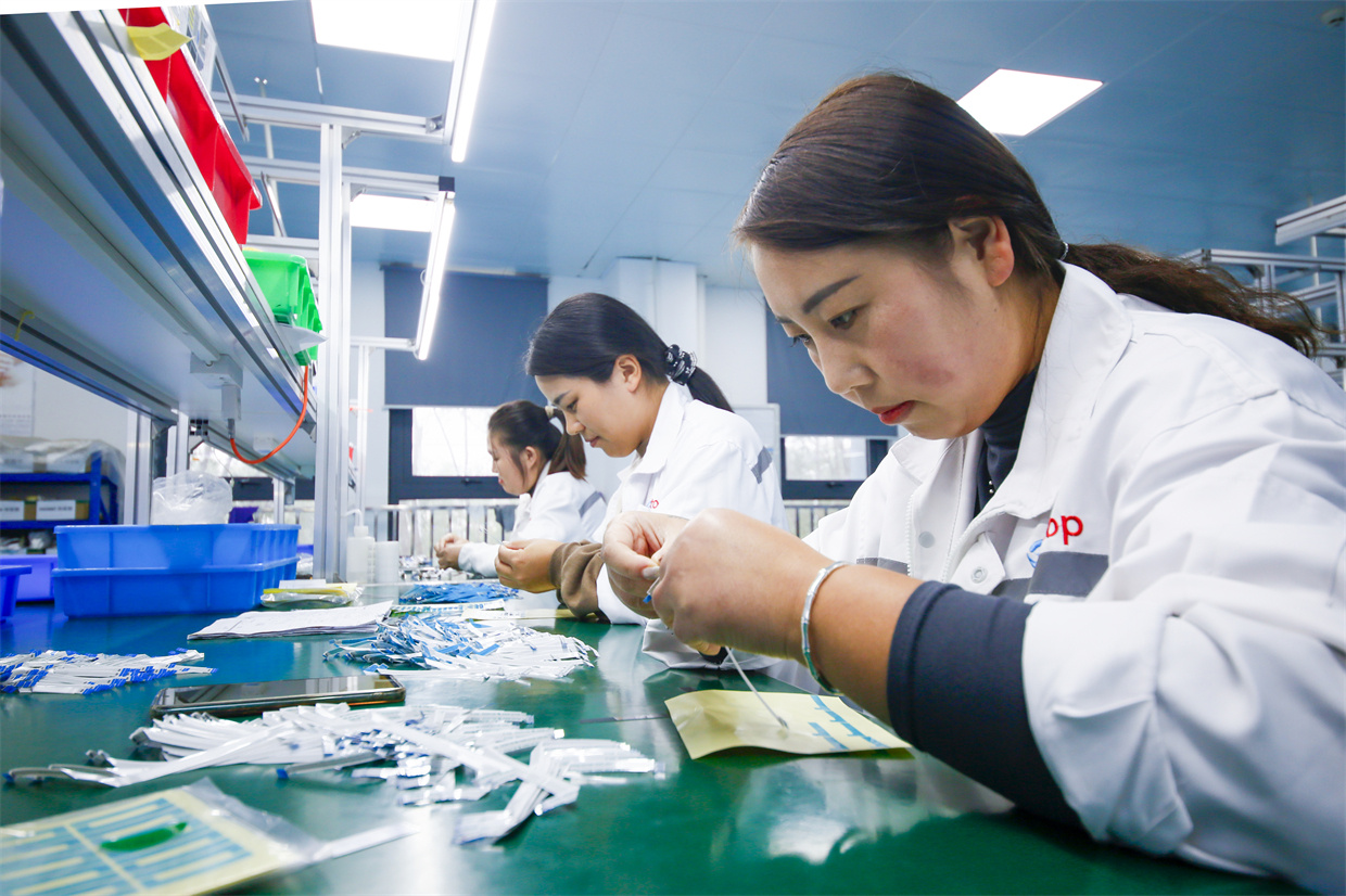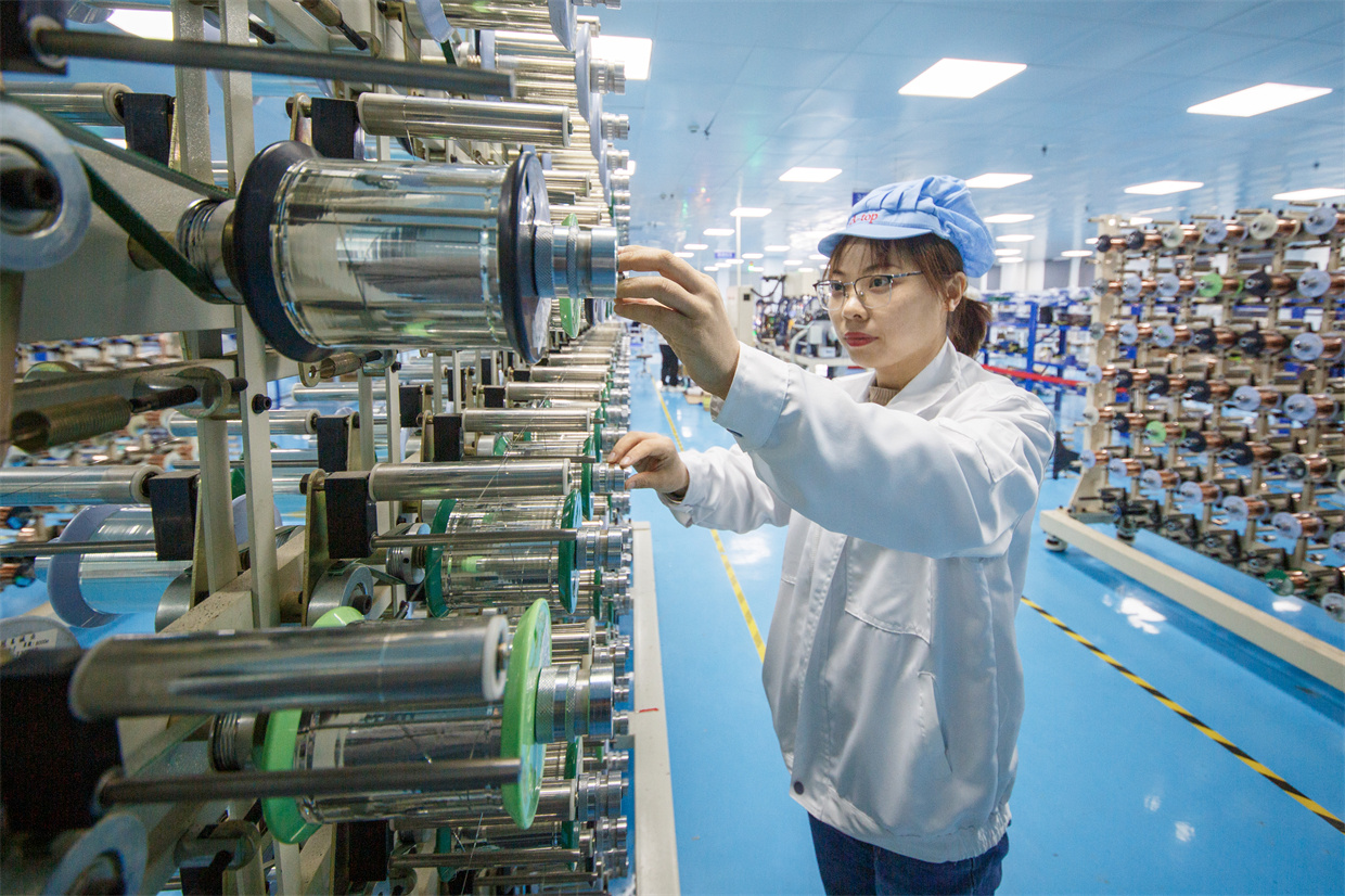 商丘中轩电子科技有限公司电子线束生产车间内,工人正在生产线上作业。 徐泽源 摄