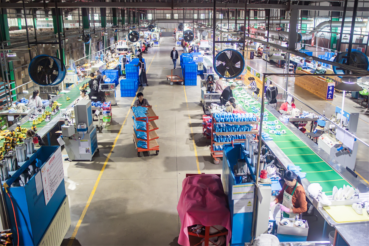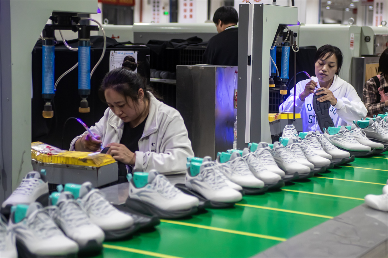 2025年10月9日,国庆中秋假期结束后的首个工作日,河南省商丘市睢县高新技术产业开发区内各企业开足马力赶订单,全力冲刺四季度生产目标。图为睢县一制鞋企业生产车间内,工人在制鞋流水线上忙碌。 徐泽源 摄