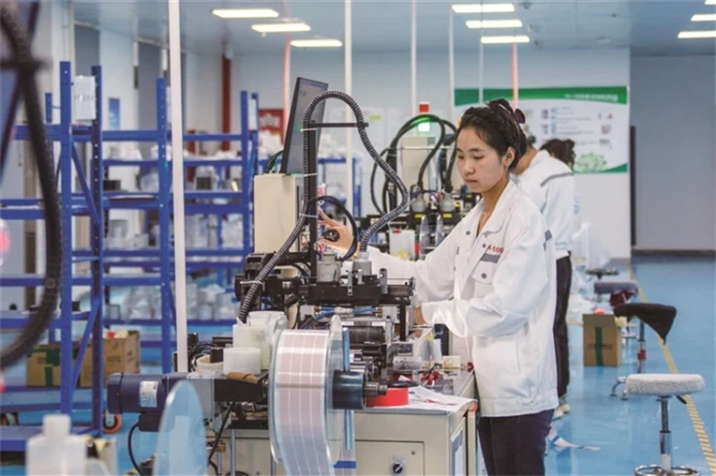 10月9日,在位于河南省睢县高新技术产业开发区的商丘中轩电子科技有限公司电子线束生产车间内,工人正在生产线上赶制订单,全力冲刺四季度目标。徐泽源摄/中经视觉(来源:中国县域经济报)