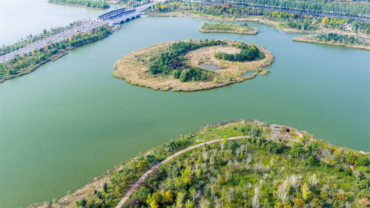 无人机镜头下,初染秋色的植被一团团、一簇簇,装点着恒山湖湿地。 徐泽源 摄