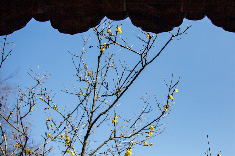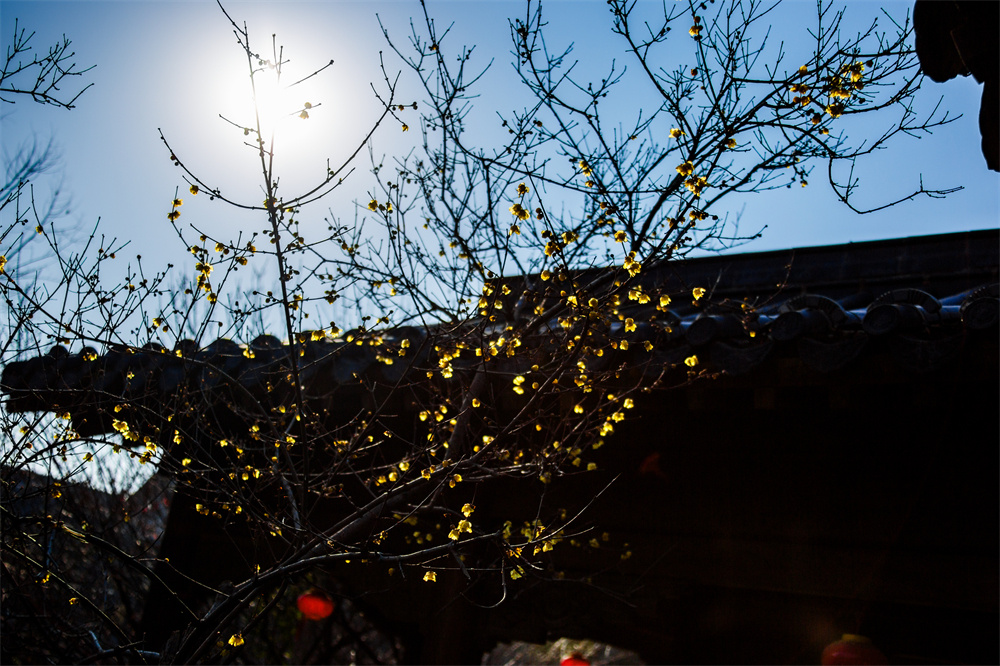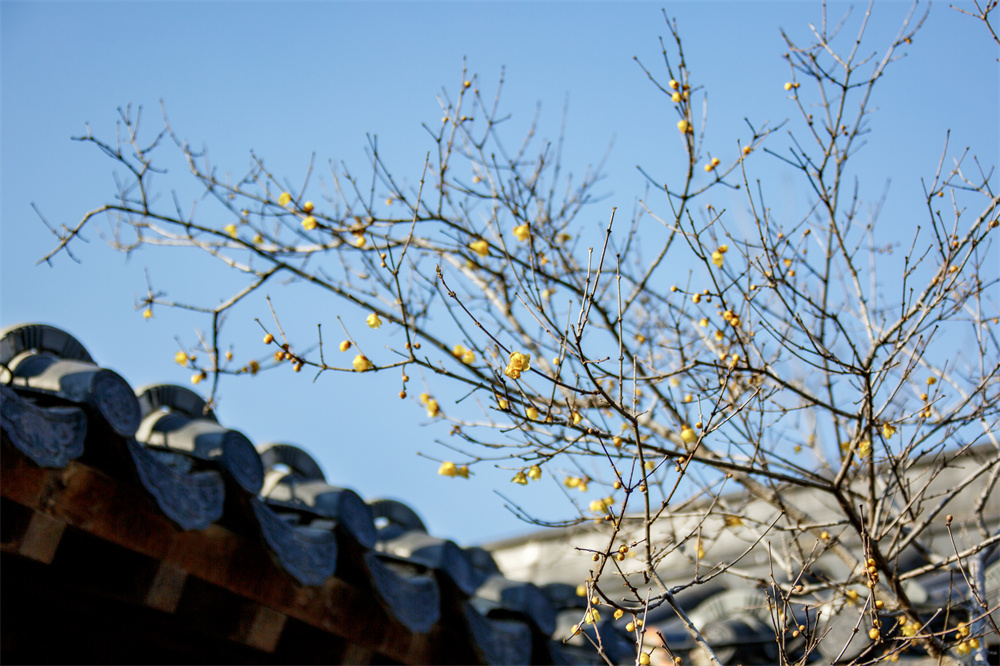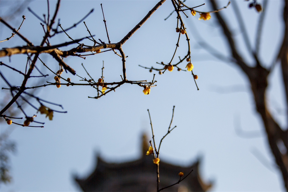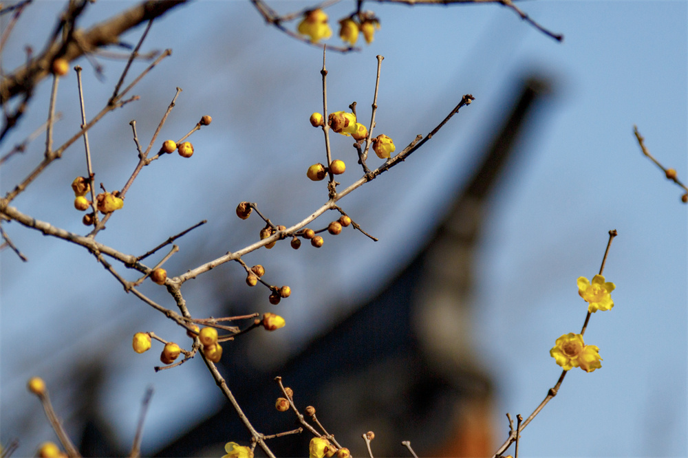 绽放的蜡梅花与远处建筑上的戗脊相映成趣 徐泽源 摄