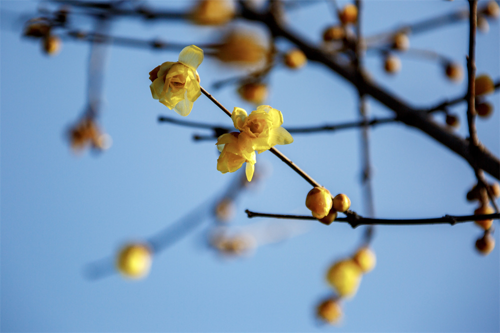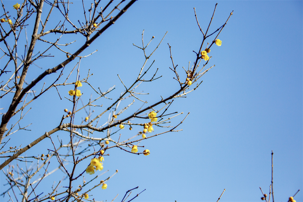 蜡梅花,蜡质一般晶莹的花朵,俏丽地点缀在无叶的枯枝上。 徐泽源 摄