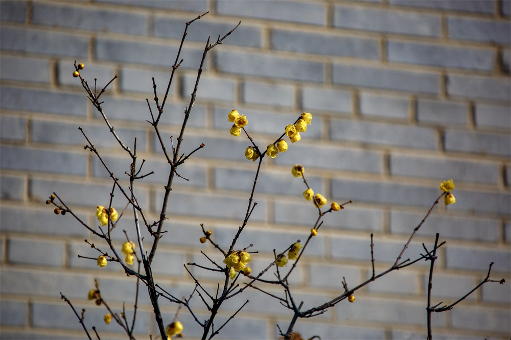 墙角边,朵朵绽放的蜡梅花。 徐泽源 摄