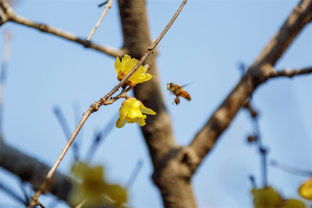 绽放的蜡梅花挂满枝头,吸引了蜜蜂前来采取花蜜。 徐泽源 摄