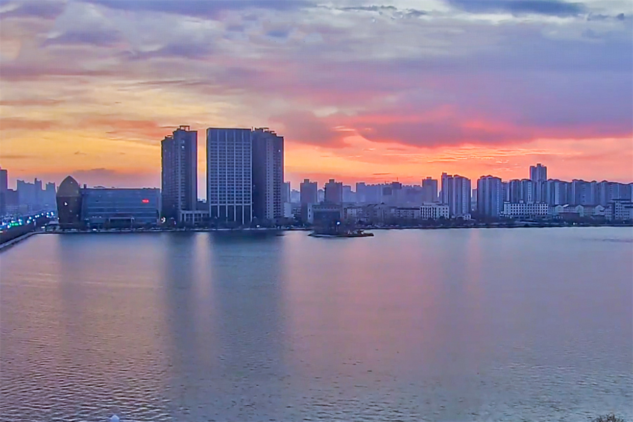 霞光与湖水、小岛等交相辉映,成为一道亮丽的风景线。 徐泽源 摄