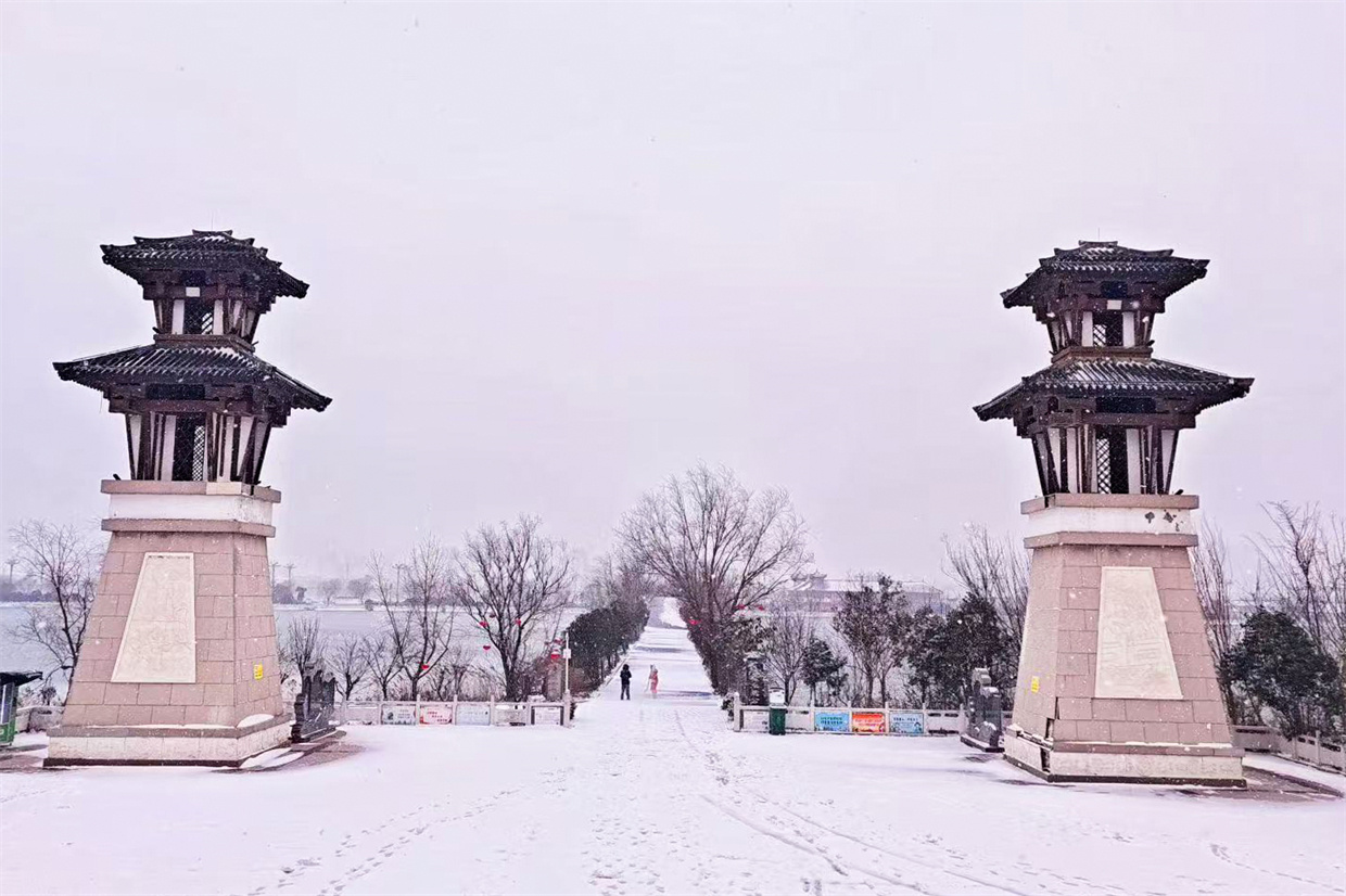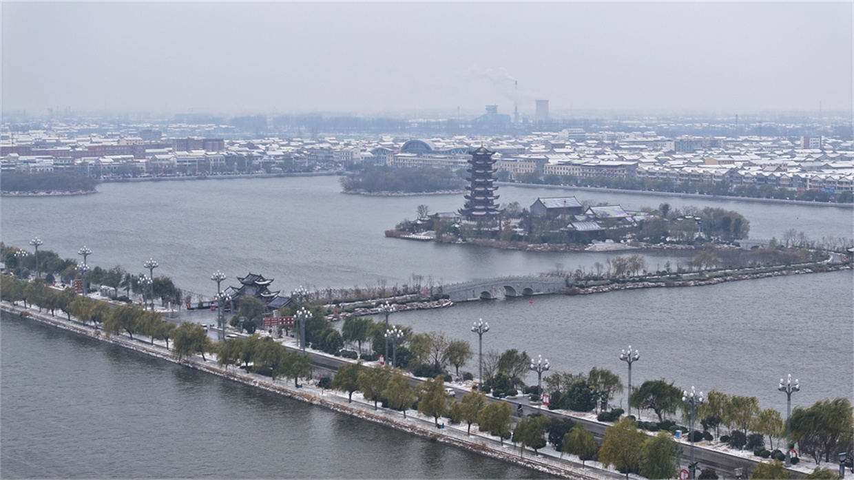 2026年1月19日,河南省商丘市睢县普降大雪。雪后的中原水城——睢县银装素裹,白雪与城市交相辉映,胜似一幅冬日水墨画卷,令人心旷神怡。图为1月20日无人机镜头拍摄的睢县凤鸣岛景区。 徐泽源 摄