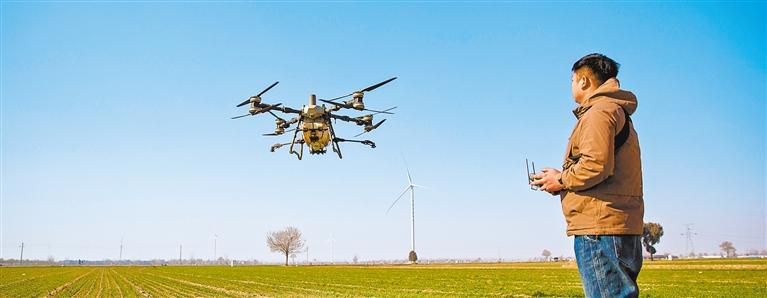 1月13日,河南省商丘市睢县皇台村高标准农田,农技人员操控植保无人机对冬小麦进行高效施肥与除草作业。徐泽源摄(中经视觉)