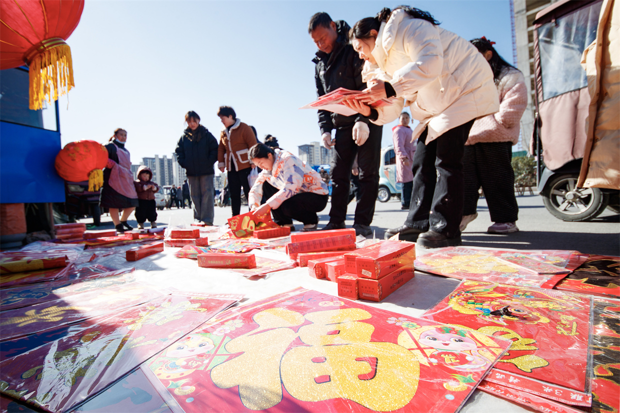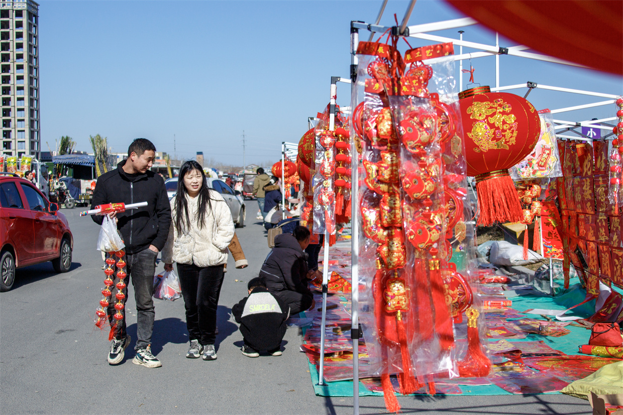 春节临近,年味渐浓。河南省商丘市睢县各大集市、商场张灯结彩、喜气洋洋,人们逛集市、办年货,喜迎新春佳节。图为2026年2月5日,群众在睢县凤城街道汤庙村年货大集上选购春节饰品。 徐泽源 摄