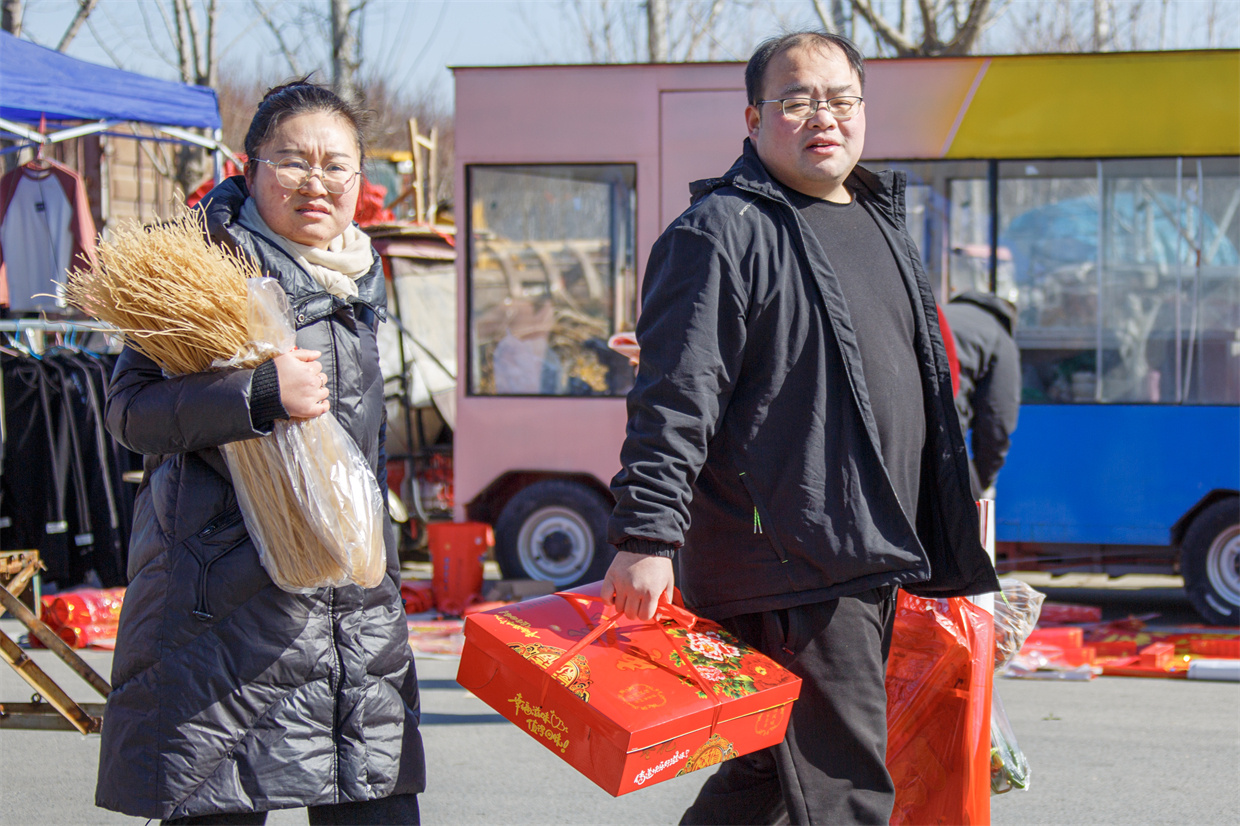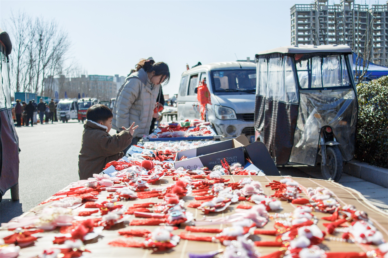 在尤吉屯乡一集市摊位内,群众在选购春节饰品。 徐泽源 摄