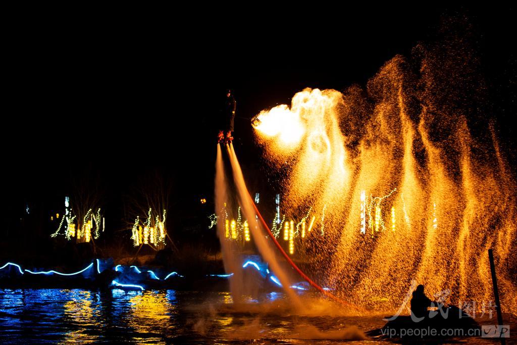 2026年2月17日,河南省商丘市睢县凤栖湖景区内灯光璀璨,景色迷人,民间艺人正在表演水上火壶。