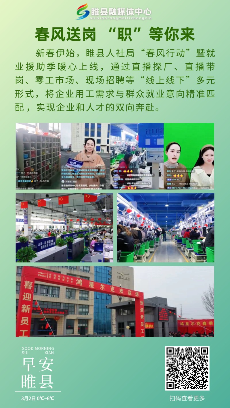 2月28日,2026年河南省“春风行动”就业援助季暨区域劳务协作活动在商丘市举行。睢县人社部门组织10家重点企业现场招聘,着力引进专业人才,为县域发展注入活力。 活动现场,睢县“返乡创业成果”与“人力资源品牌”两大展区特色鲜明。云腾农业百龄菇、尤吉屯鹿茸酒、平岗冬枣等农特产品展示“归雁经济”成果;鸿星尔克、中乔体育等企业展品,彰显“中国制鞋产业基地”实力。 企业招聘专区咨询者络绎不绝,工作人员详细讲解岗位政策。睢县还通过多个新媒体平台同步直播“带岗”,实现线上线下联动。 睢县人社局工作人员表示,通过多种方式搭建对接平台,实现人岗精准匹配。睢县将以此次活动为契机,持续深化劳务协作,做强人力资源品牌,优化就业创业服务。