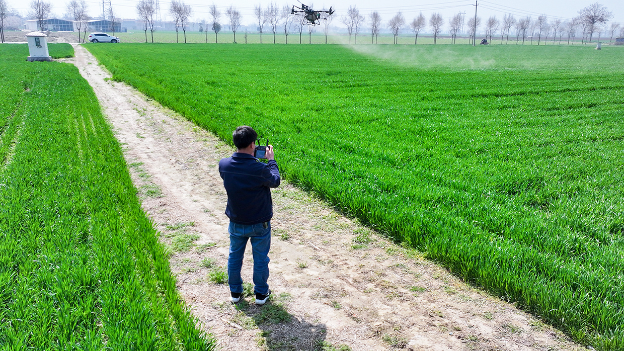农技人员操控植保无人机对冬小麦进行高效施肥与除草作业 徐泽源 摄