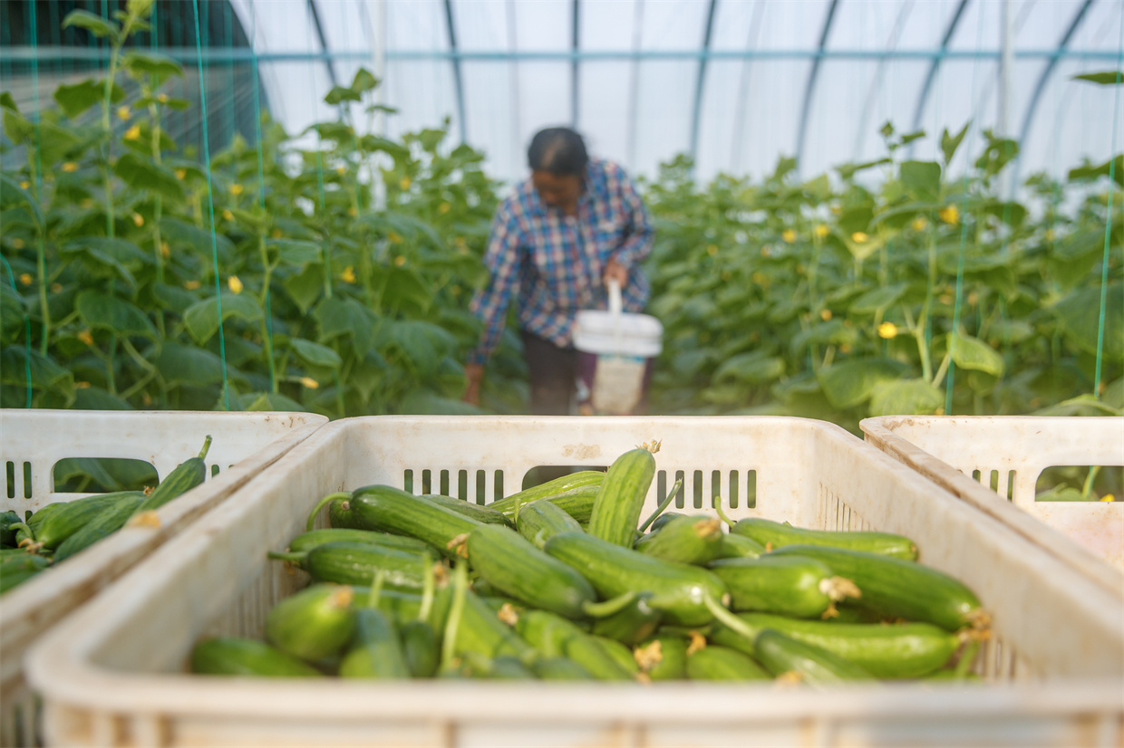在睢县“粮安民富”种植产业园内,菜农正在采收黄瓜。 徐泽源 摄