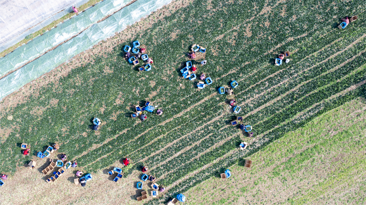 城关镇袁庄村一处农田内,农户正在采收菠菜。 徐泽源 摄