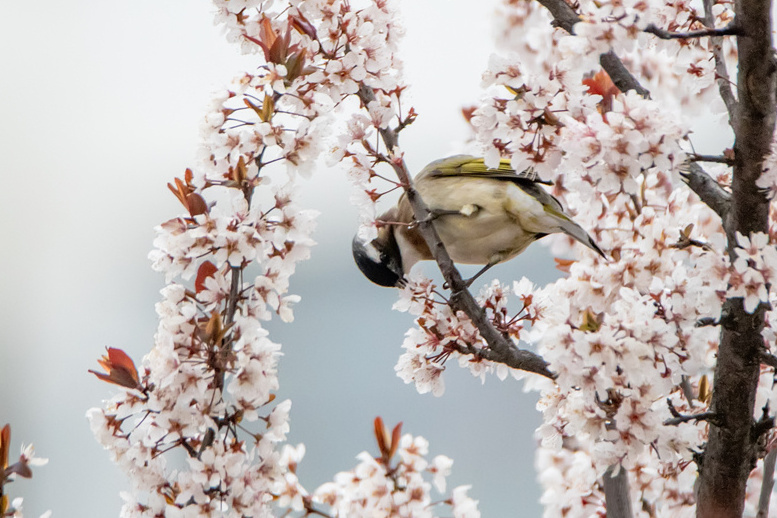 白头鹎在啄食李花 徐泽源 摄