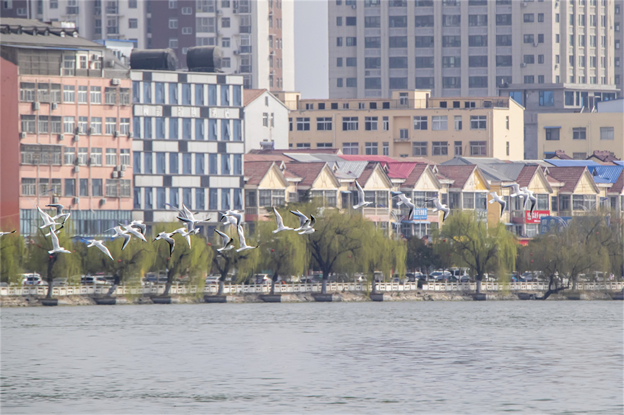 春风拂柳万千条,暖阳破晓春意闹。2026年3月23日,河南省商丘市睢县北湖景区内蓝天如洗,花红柳绿,成群结队的鸟儿飞上枝头尽享春日暖阳。图为成群结队的红嘴小鸥在北湖上空翱翔。 徐泽源 摄