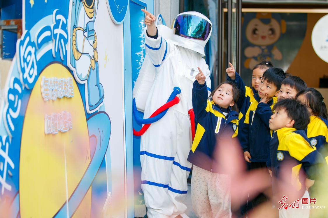 2026年4月23日,在河南省商丘市睢县星之梦幼儿园"逐梦航天童心向未来"主题的科普活动现场,老师正在通过情景模拟向孩子们讲解航天航空知识。(徐泽源摄/光明图片)