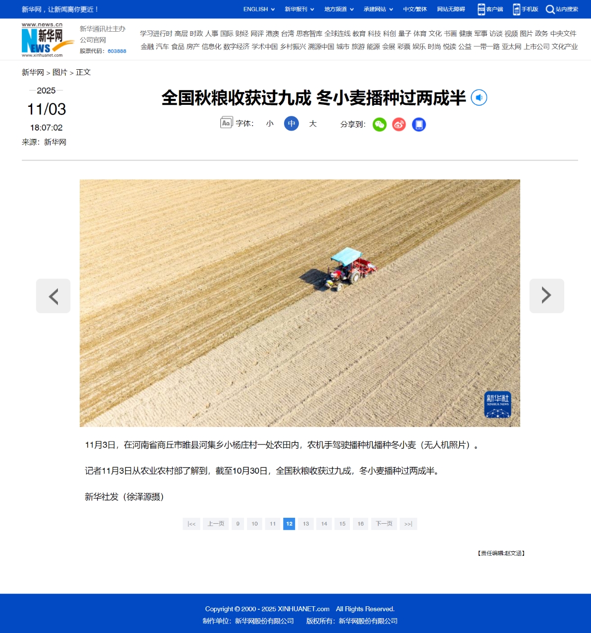 新华网关注睢县|全国秋粮收获过九成 冬小麦播种过两成半 |