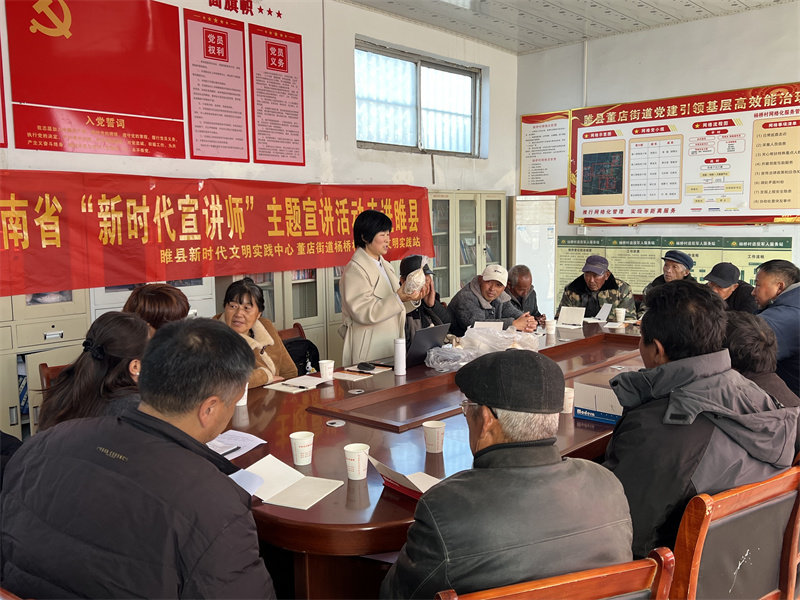 为深入学习宣传贯彻习近平新时代中国特色社会主义思想,推动党的创新理论进乡村、入民心、见实效,切实把理论优势转化为发展动能,11月25日,河南省“新时代宣讲师”主题宣讲活动在董店街道杨桥村举行。睢县新时代文明实践中心建设指导中心驻村工作队特邀河南省“新时代宣讲师”朱晓琴教授为村民授课。
