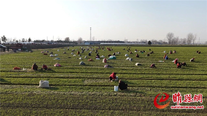 12月26日,匡城镇许天寺村的荠菜种植基地一片繁忙景象。100多名村民分散在田间,熟练地采收着鲜嫩的荠菜——剪根、择叶、打包,动作流畅,指尖飞舞。荠菜种植,已成为当地群众增收的好产业。