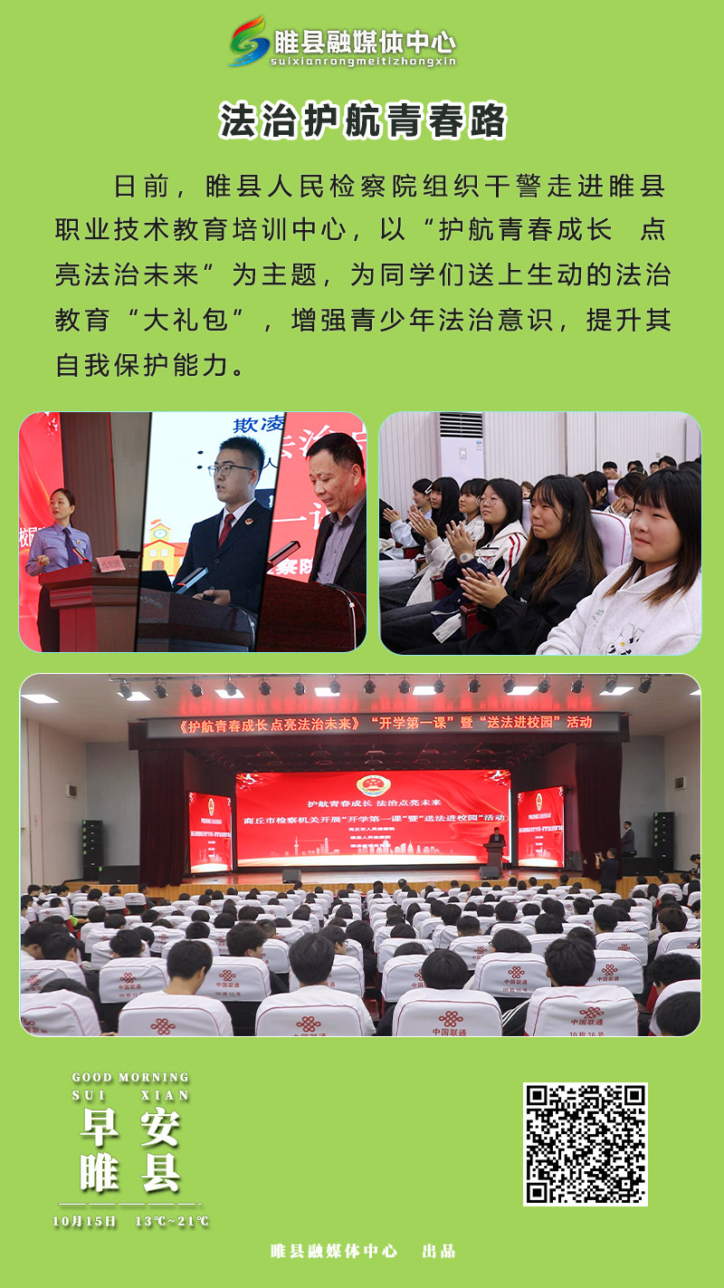 10月14日,睢县人民检察院到睢县凤翔学校开展预防未成年人违法犯罪专题讲座。讲座围绕《中华人民共和国预防未成年人犯罪法》《中华人民共和国未成年人保护法》等法律法规,结合检察机关办理的涉未成年人真实案例,以案释法、以法论事,用通俗易懂的语言,向同学们详细讲解了未成年人常见犯罪类型、违法犯罪行为的严重危害、刑事责任年龄的法律规定、如何加强自我防范远离违法犯罪以及遭遇不法侵害时如何有效自我保护等内容。同时通过情景模拟、互动问答、发放未成年人保护法律知识宣传彩页等形式,引导同学们树立法治思维,学会运用法律武器维护自身合法权益。