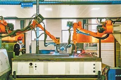 10月20日,在睢县先进制造业开发区鼎能吉研电子科技有限公司动力电池全自动干燥箱焊接生产线上,数台机械臂开足马力,生产出口订单。 徐泽源 摄(河南日报)