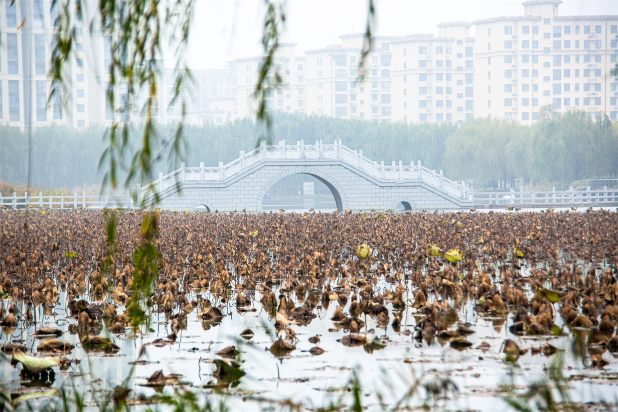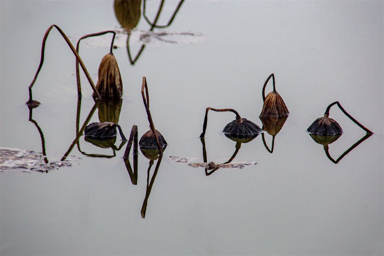 荷塘里不再是昨日的生机和艳丽,只剩片片残荷的枝干,这情景透露出一份难得的寂静之美。 徐泽源 摄
