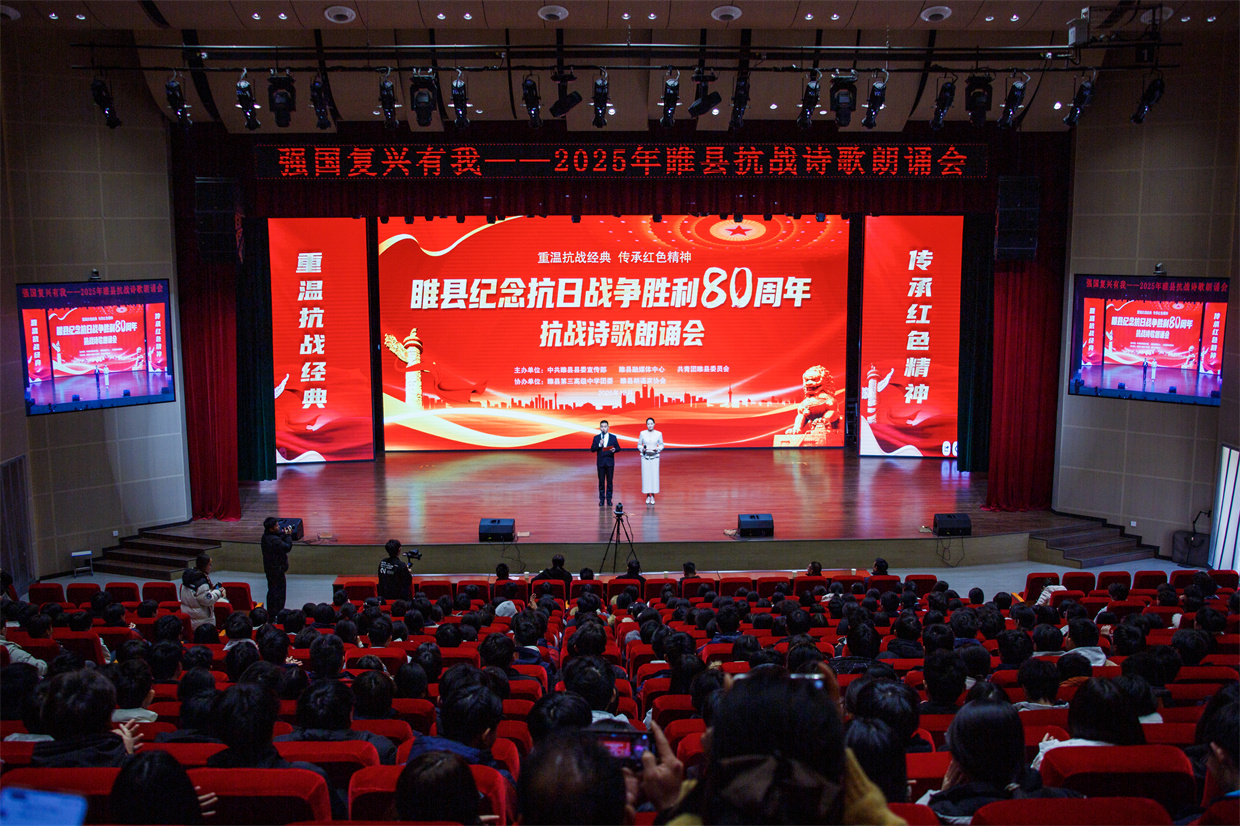 为纪念抗日战争胜利80周年,歌颂党领导人民所创造的辉煌成就,激发广大学生的爱党、爱祖国、爱家乡的热情,2025年12月4日,由中共睢县县委宣传部、睢县融媒体中心、共青团睢县委员会联合主办的纪念抗日战争胜利80周年抗战诗歌朗诵会在河南省商丘市睢县第三高级中学举行。图为诗歌朗诵会活动现场。徐泽源 摄