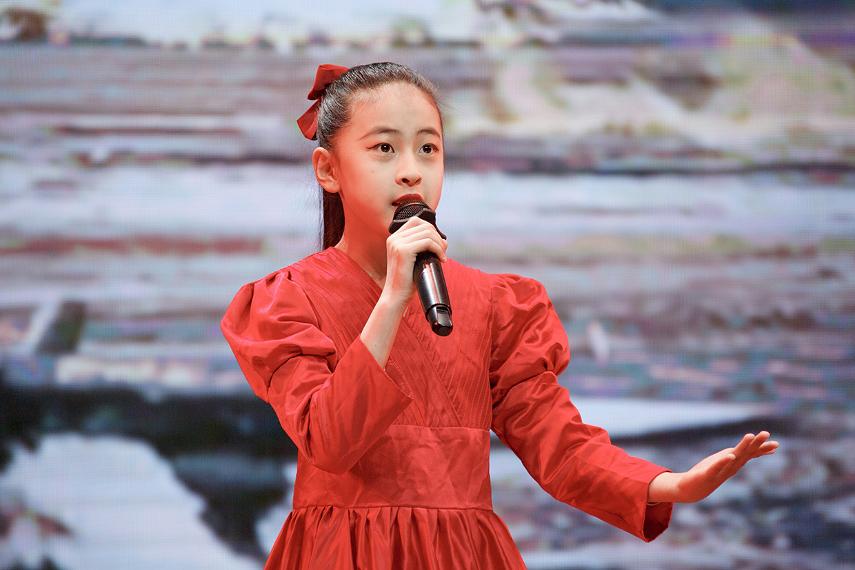 朗诵会活动中还穿插了《如愿》《唱支山歌给党听》《五星红旗》等经典曲目的独唱表演。图为睢县古襄路小学学生徐瑜阳正在演唱歌曲《如愿》。 徐泽源 摄