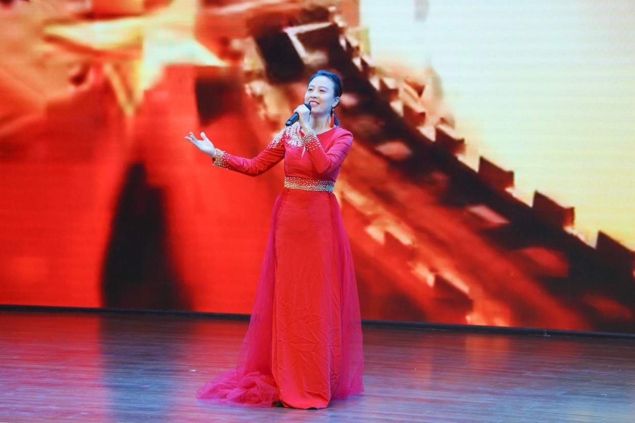 睢县高级中学青年教师刘雪鸣正在演唱歌曲《五星红旗》 徐泽源 摄
