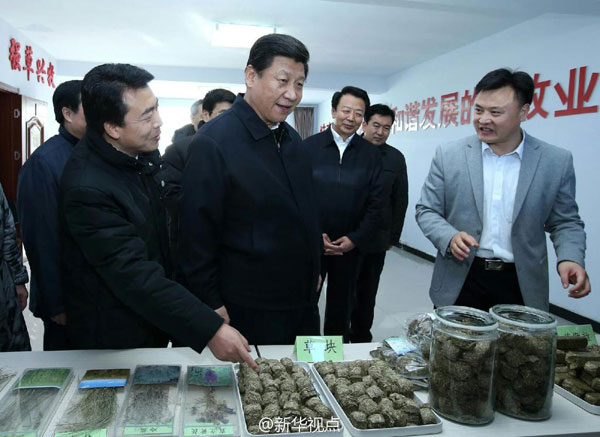 习近平来到毛登牧场饲草产业基地。桌上摆放着各种草标本和加工的草块、草颗粒。负责人拿起针茅草说:“这种草牛羊喜欢吃,但夏天长出倒刺尖,羊吃了易刺穿皮,羊皮就不值钱了,加工成草颗粒就没问题。”总书记笑着说:“这可是牛马羊爱吃的香饽饽啊。”