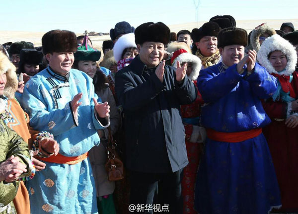 冬季那达慕活动上,习近平参加了“五畜祈福”仪式。他用无名指蘸上马奶酒向外弹了三下,然后说,我借“五畜祈福”寓意,祝新年风调雨顺,五谷丰登,草畜兴旺。让我们继续弘扬锲而不舍的精神,同心同德努力奋斗。祝祖国更加繁荣昌盛、各族人民更加幸福安康。