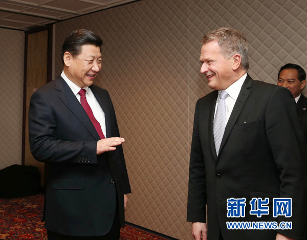 习近平表示,去年4月你访华期间,我们一致同意将中芬关系定位提升为面向未来的新型合作伙伴关系,将投资、环保、创新、城镇化作为合作重点领域。一年来,这些合作取得新进展,“美丽北京”环保项目和芬华创新中心是其中的亮点和典范。希望双方围绕两国关系新定位,加紧商谈有关政治文件,更好规划各领域合作。双方要共同办好明年赫尔辛基艺术节中国主宾国活动。芬兰是欧盟重要成员国。中方愿同芬方携手推进中欧合作。