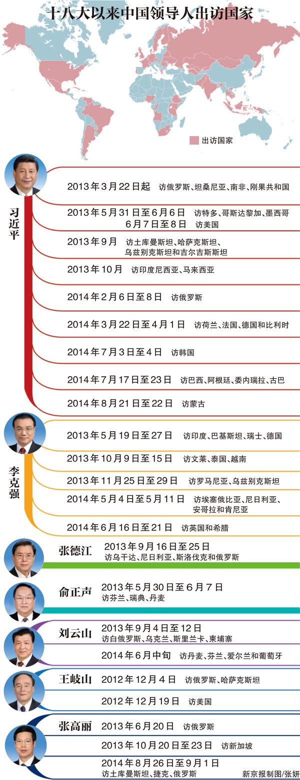 据新京报记者统计,十八大以来,政治局七名常委到访49个国家;中国外交完成全球初步布局