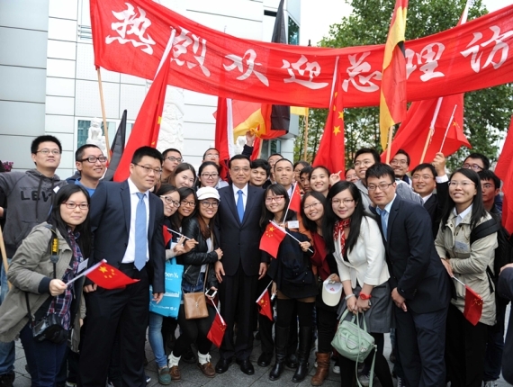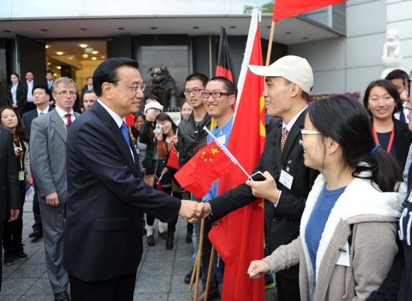 使馆主楼外,还有不少中国留学生。他们打着“欢迎总理访德”的横幅,挥舞着中德两国的国旗。见到克强总理走来,他们一下子围了上去,争相与克强总理握手。