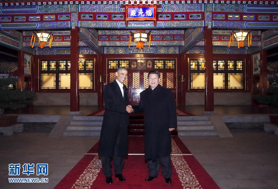 11月11日晚,国家主席习近平在中南海同美国总统奥巴马举行会晤。这是两国元首在瀛台涵元殿前握手。 新华社记者鞠鹏摄