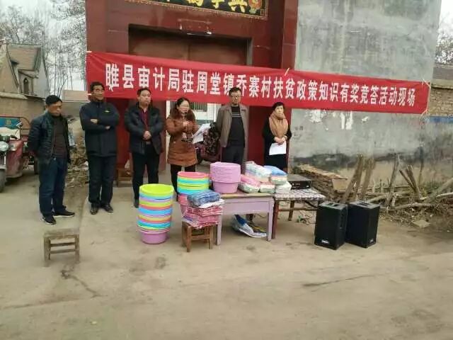 为让广大贫困户知晓各项所享受扶贫政策,提高政策受益覆盖面及知晓率,营造良好的扶贫政策宣传氛围,助推全县精准扶贫、精准脱贫工作,12月14日至15日,睢县审计局按照县脱贫攻坚统一工作部署,在周堂镇乔寨村开展了扶贫政策知识有奖竞答活动。