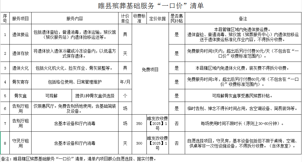 睢县殡葬基础服务“一口价”清单