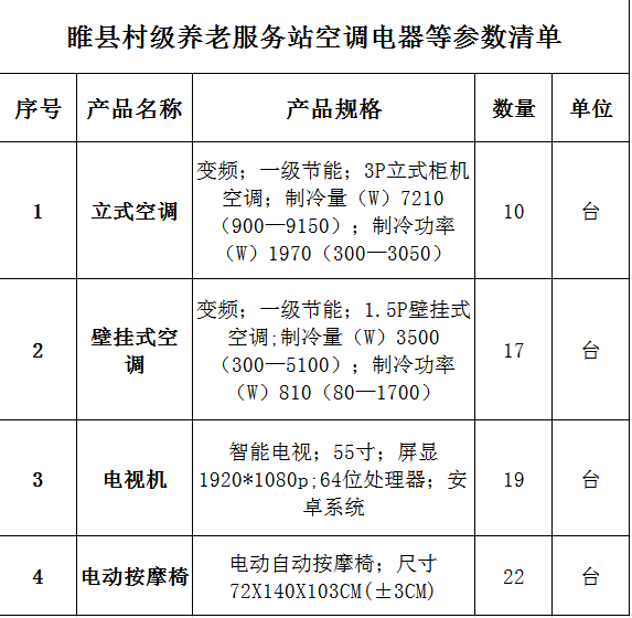 为了补齐农村公共服务短板、推进城乡公共服务均等化,让村民在家门口享受到规范、便捷、多元的服务,切实提升群众的幸福感、满足感、获得感,现决定对睢县村级养老服务站增设空调电器等设施设备,相关用品参数清单详见附件。