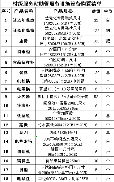 为进一步完善村级服务站功能布局,满足村内老年人多样化用餐需求,更好适配老年人行动特点与饮食需求,现决定对睢县村级养老服务站购置老年助餐设备,相关用品参数清单详见附件。