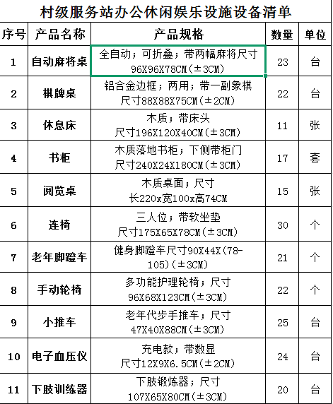 为进一步完善村级服务站功能布局,满足村民日常休闲娱乐需求,提升养老服务站的吸引力与使用频率。现决定对睢县村级养老服务站购置休闲娱乐设施设备,相关用品参数清单详见附件。