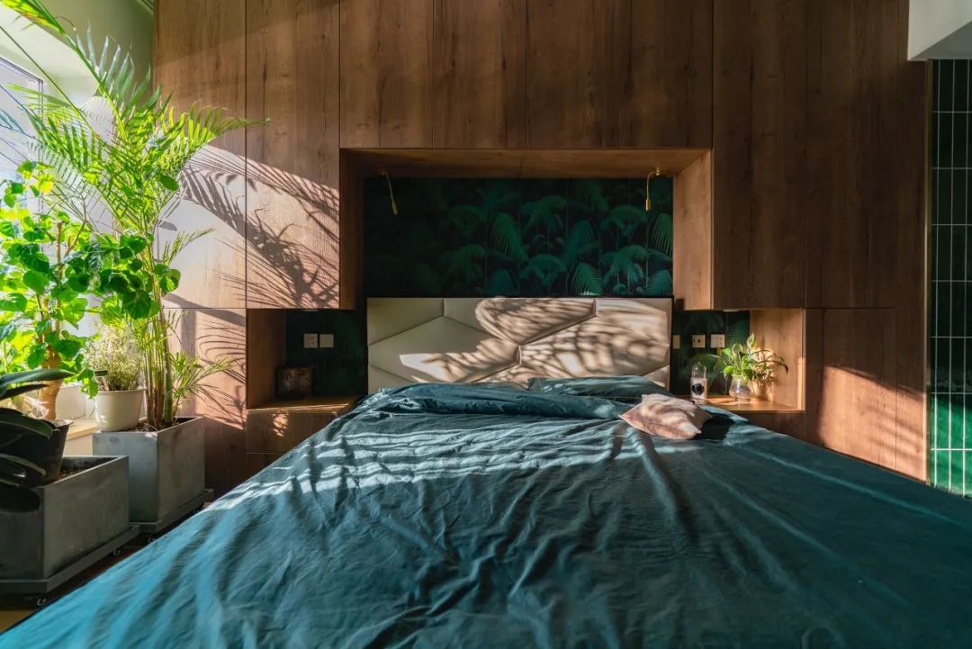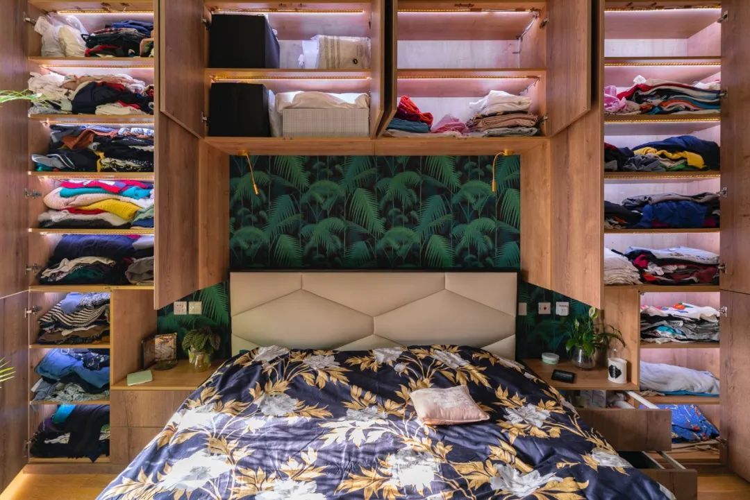 晓艺设计两位设计师的卧室,就是自己DIY的墙面收纳系统。如果使用柜子,这个屋子真的就一点都没法用了。