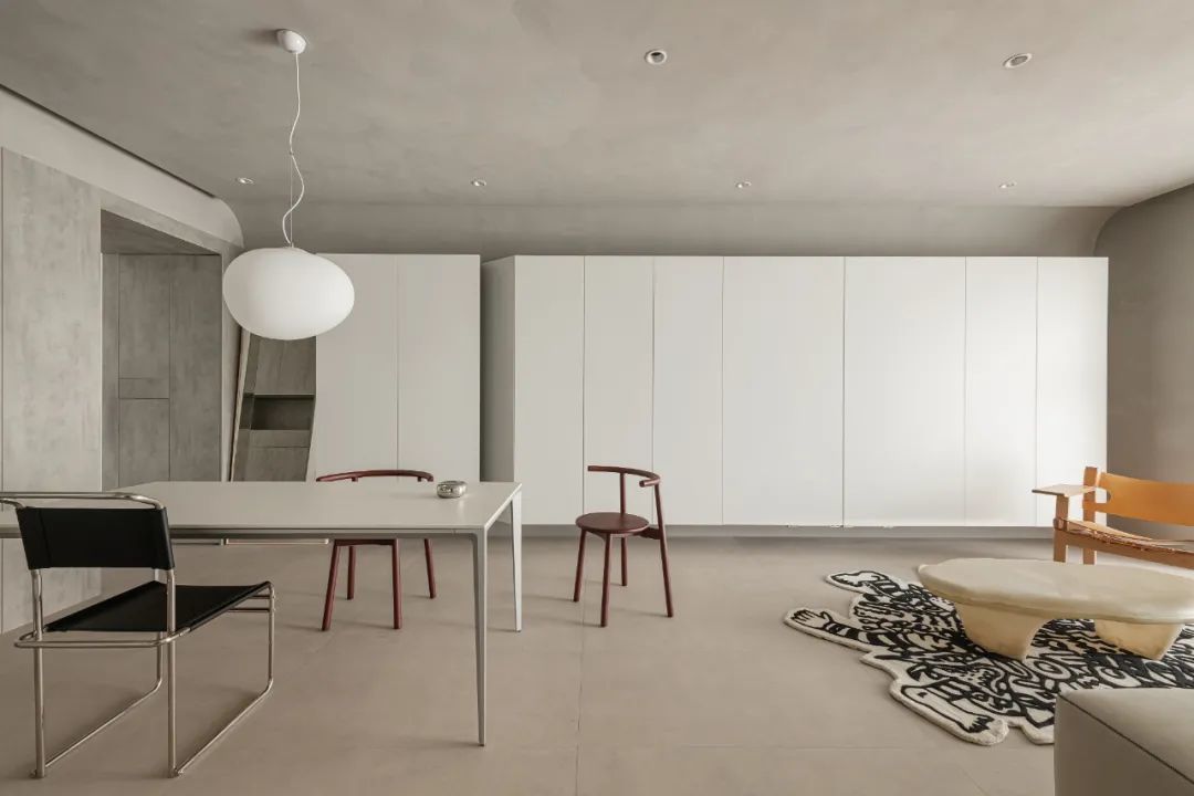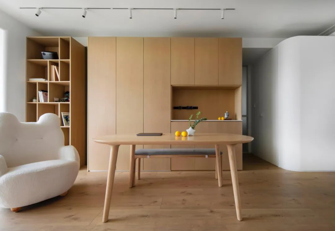 东己壤则是将柜子悬在半空,下面方便清洁。上部留出空间,并且将墙面和天花板用弧线连接。