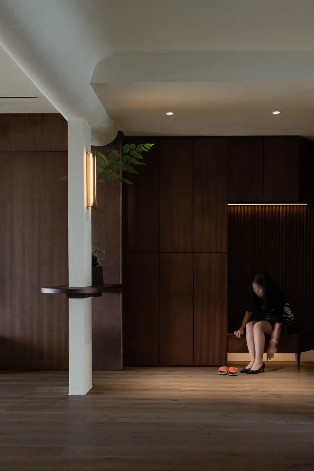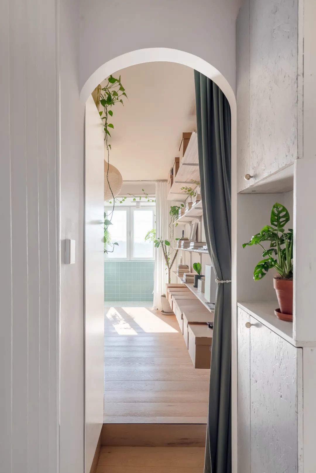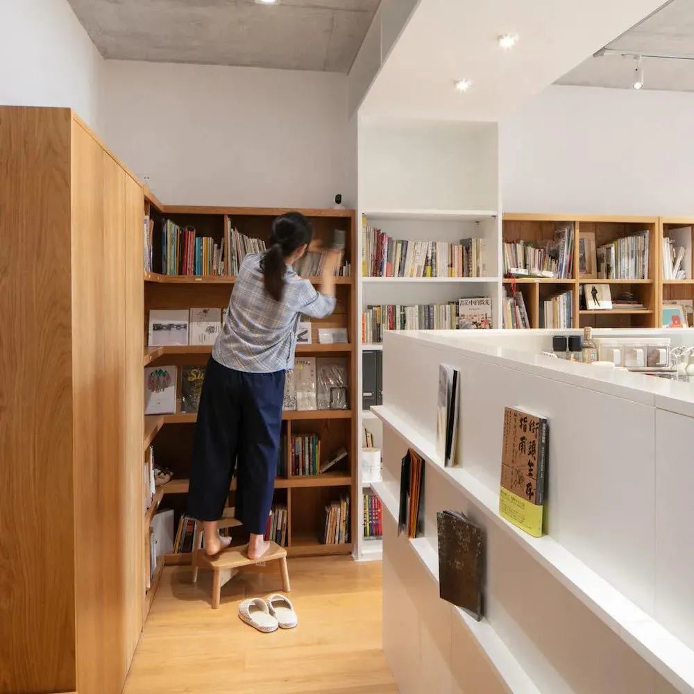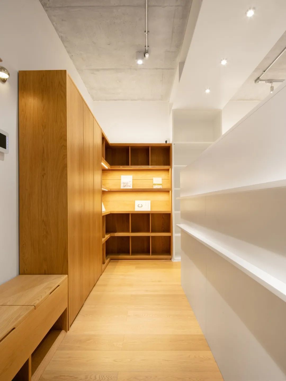 武汉小小空间事务所在这件屋子的入口走廊设计了一整廊的柜子,如果都到顶,那走廊就会看着更加狭窄。